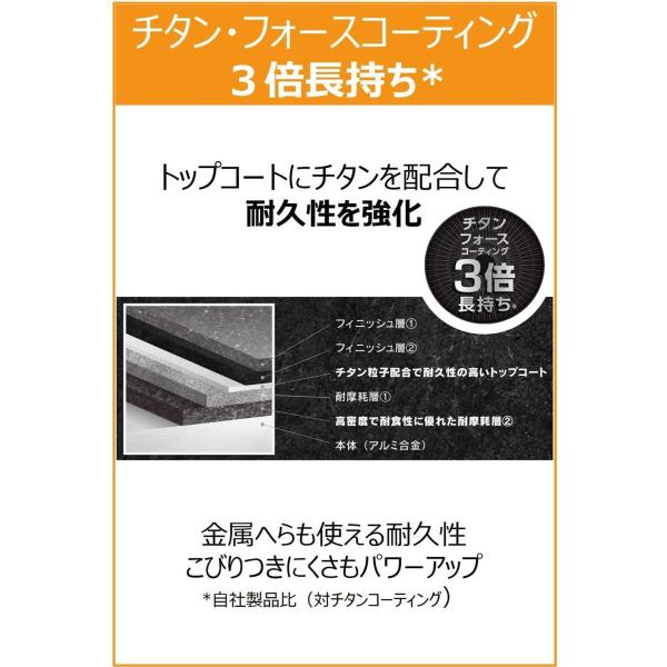 従来品比でコーティングの耐久性がアップ、こびりつきにくさがより長持ち