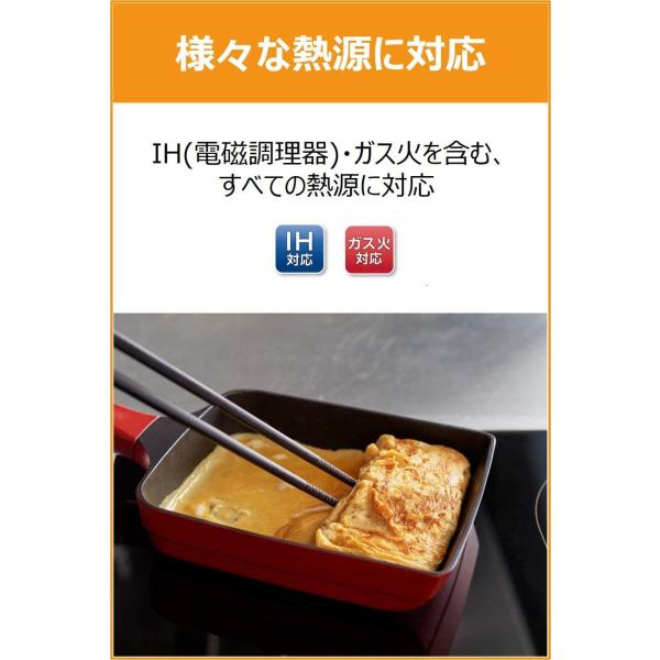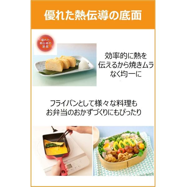 厚地のキャストアルミ(鋳物)製で熱伝導と保温性に優れ、卵焼きがきれいに仕上がる