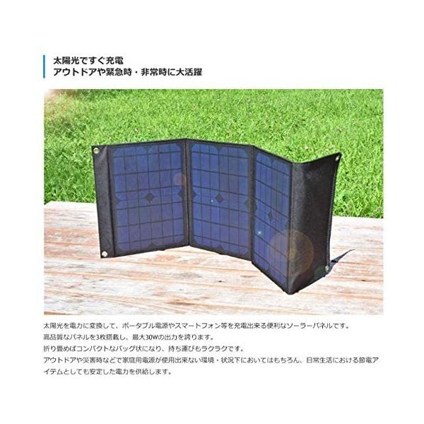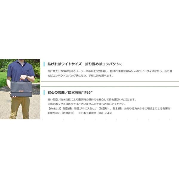 - ◇ソーラーパネル材質:単結晶シリコン ◇動作電圧/電流:DC:18V 1.66A・USB:5V 2.1A ◇最大出力:30W ◇開放電圧:21V ◇変換効率:19% ◇使用可能温度:-20-80℃ ◇防塵/防水等級:IP65 ◇最大外形寸法(約):最大:幅960×高340×厚18mm 折り畳み時:幅340×高250×厚40mm ◇質量(約):1.4 kg ◇生産国:中国 【DCケーブル】 ◇端子サイズ:外径/内径:5.5/2.1mm ◇ケーブル長(約):1500mm 【3-in-1ケーブル】 ◇端子形状:入力:USB-A 出力:micro-USB、Lightning、USB Type-C ◇ケーブル長(約):1200mm ◇材質:PP