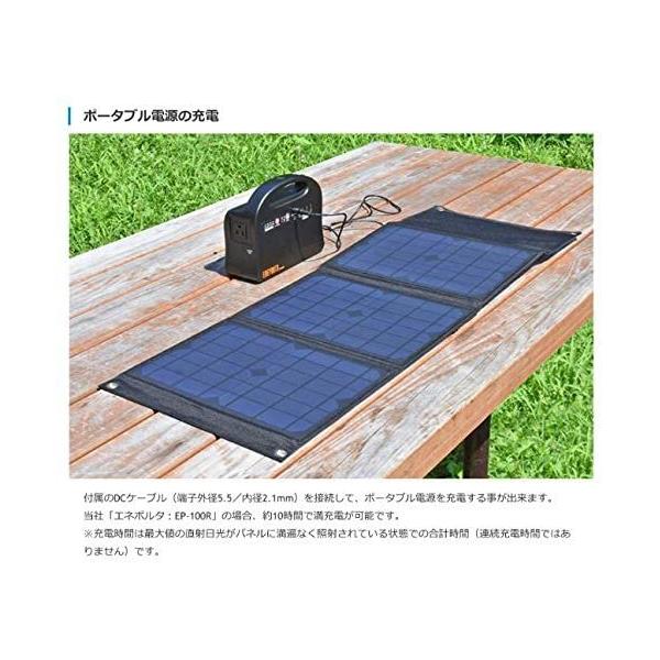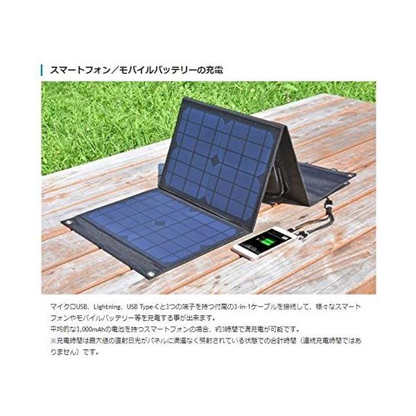 - ◆付属のDCケーブルを接続して、ポータブル電源を充電する事が出来ます。 メーカー製「エネポルタ:EP-100R」の場合、約10時間で満充電が可能です。 ※充電時間は最大値の直射日光がパネルに満遍なく照射されている状態での合計時間です。 ◆マイクロUSB、Lightning、USB Type-Cと3つの端子を持つ付属の3-in-1ケーブルを接続して、様々なスマートフォンやモバイルバッテリー等を充電する事が出来ます。 平均的な3,000mAhの電池を持つスマートフォンの場合、約3時間で満充電が可能です。 DC端子とUSB端子は同時に接続して使用出来ますので、ポータブル電源とスマートフォンを一緒に充電したい時などに便利です。 ◆高い防塵/防水性能により雨天時の屋外でも安心して持ち運びいただけます。 ※出力ボックスは防水ではございませんので濡らさないでください。