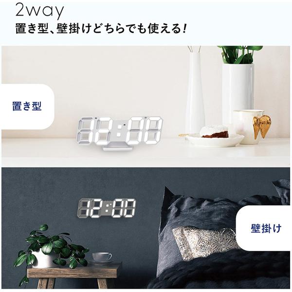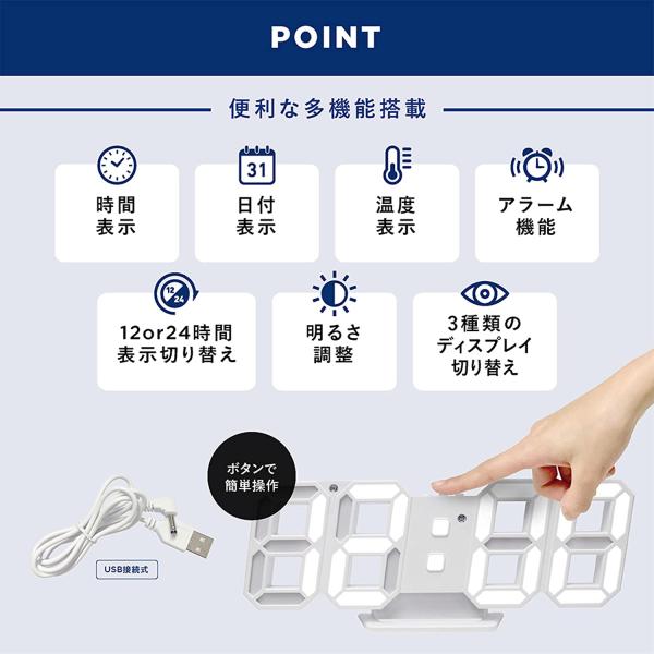 明るさ調整 3種類のディスプレイ切替、 ボタンで簡単操作、 2WAY 置き型、壁掛けどちらでも使える。