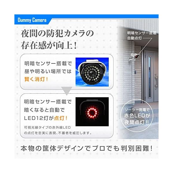 暗くなると自動で12灯ものLEDランプが赤く発光!本物の防犯カメラが作動しているようにみせかけます