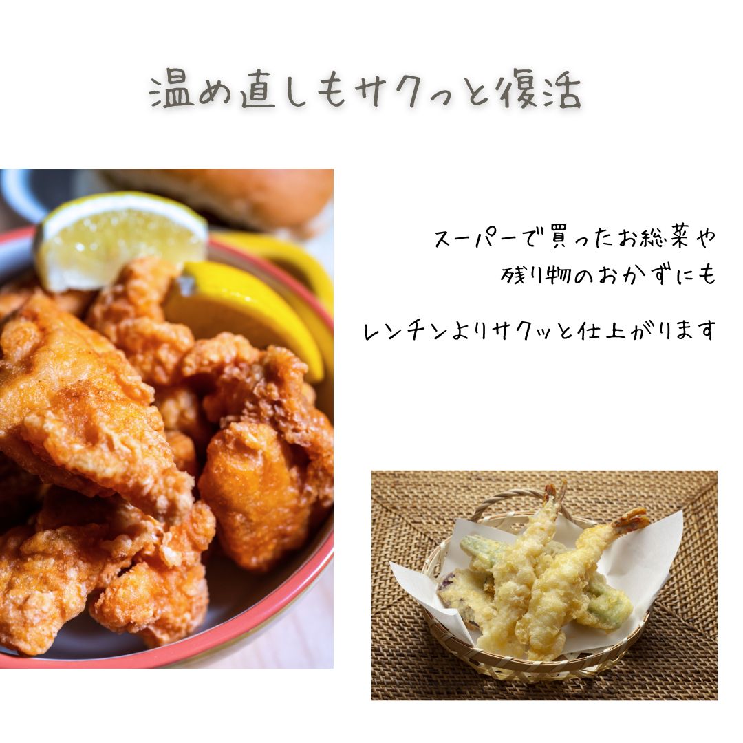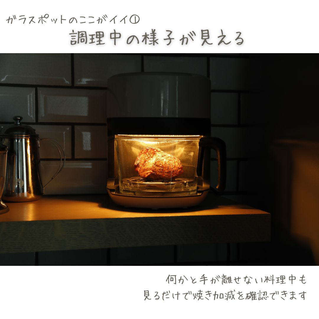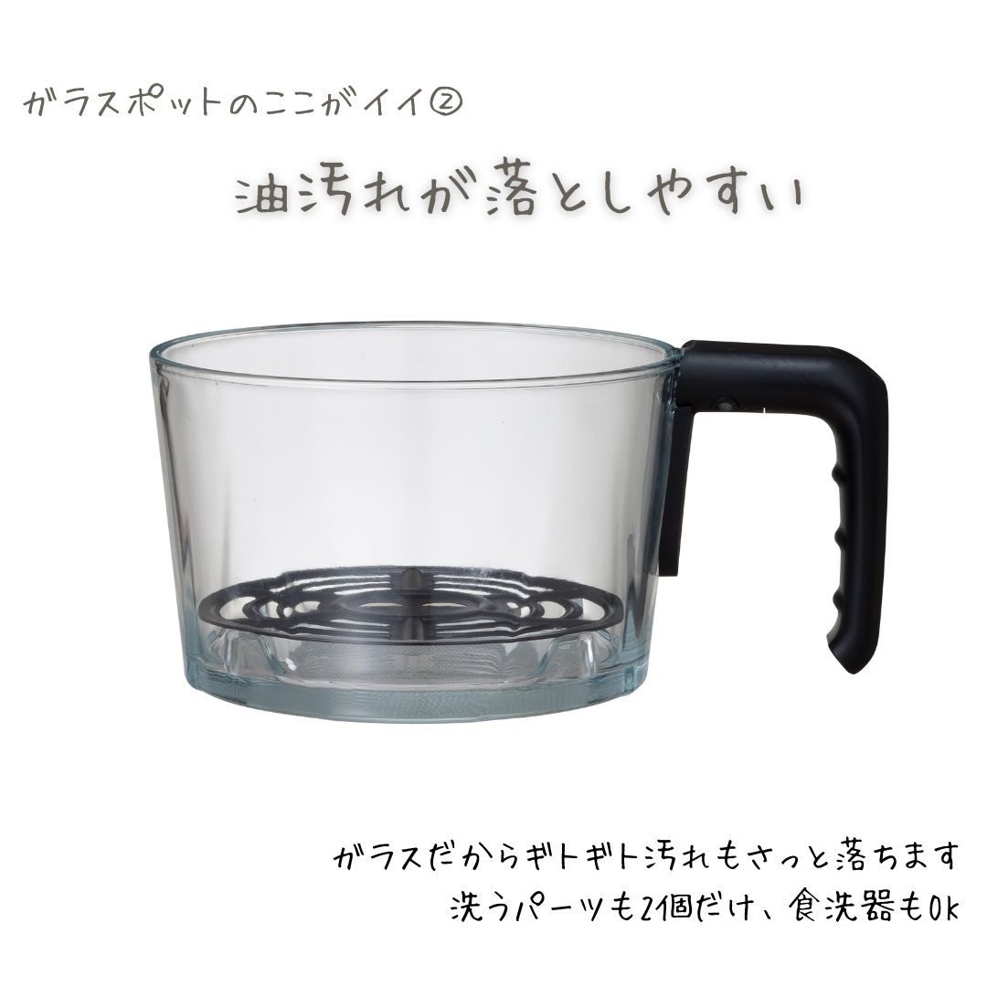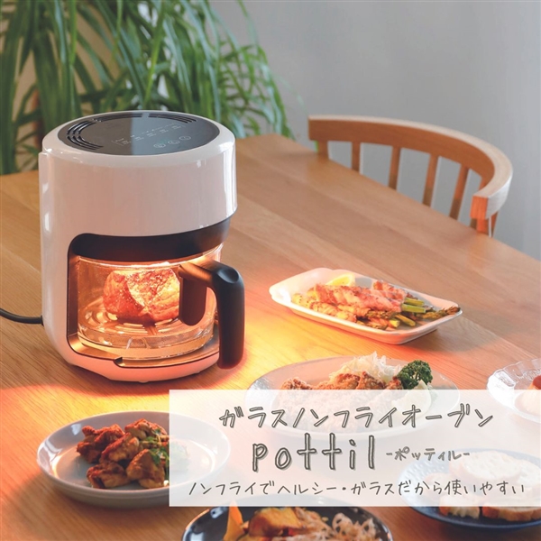 - ガラスポットだからいい ◆【調理中の食材が見える】 何かと手が離せない料理中も、外から食材の状態が分かるので便利。 ポットを開けずに中を 確認できるので、温度を下げずに最後まで調理ができます。 ◆【油汚れも落ちやすい】 ガラス素材だから油汚れも落としやすく、後片付けもラクラクです。 ノンフライでヘルシー 高温の熱風を循環させることで、油を使用しなくてもサクッとジューシーに仕上がります。 ◆【唐揚げなら脂質約29%カット】 ※鶏もも肉130gをpottilで調理した場合と、同量を油で揚げて調理した場合の比較です。 ※メーカー調べ ◆【お惣菜もサクッと復活】 買ってきたお惣菜の温め直しにも使えます。忙しい日の食卓にもサクッと幸せをプラス。 おいしく仕上がるのはもちろん、余分な油が下に落ちるので、カロリーオフにもなって 一石二鳥。 ◆【幅広い料理に使える】 調理温度は60~200℃、時間は1~60分の間で設定できます。 揚げ物はもちろん、普段のおかずから本格料理、スイーツまで、毎日の料理に使えます。 ◆暮らしになじむ使いやすさ 本体はA4用紙にすっぽりおさまるサイズ。コンパクトなボディでキッチンにちょうどいい 。 タッチパネルで簡単操作。天面がフラットなので拭きやすく、お手入れもラクラク。