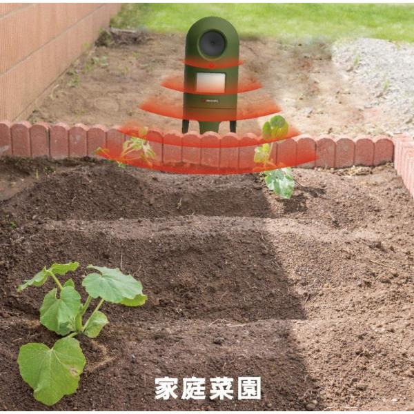 野生のネコなどに食い荒らされるなど標的にされがちな家庭菜園も、センサーと超音波で守る。