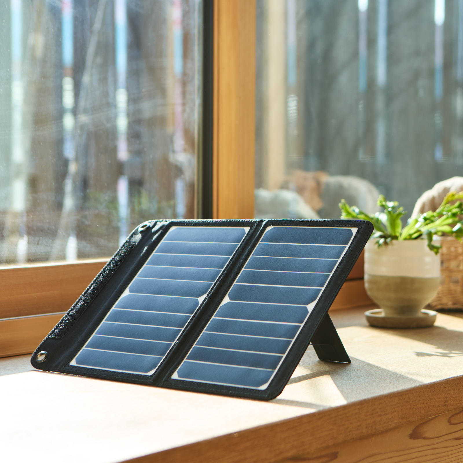 太陽光で発電、手軽に節電 【コンパクトな折りたたみ式ソーラー】