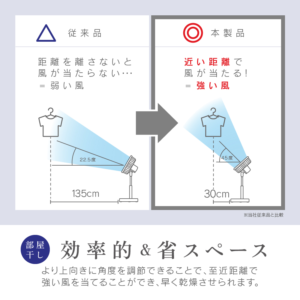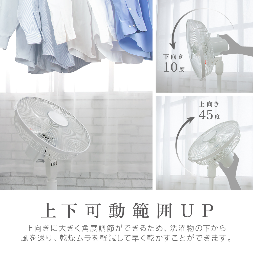 ◆シンプルで使いやすい押しボタンタイプ(メカ式) ◆部屋干しをさらに便利に!上下可動範囲UP(当社従来品と比較) ◆上向きに風を当てやすく、乾燥時間を短縮 ◆部屋干しにオススメ 上向き45度角度調節 ◇消費電力:(強風時50/60Hz) 36/37W ◇風量切替:3段階 ◇タイマー:3時間切タイマー ◇自動首振り:〇(本体操作のみ) ◇コードの長さ 約1.6m
