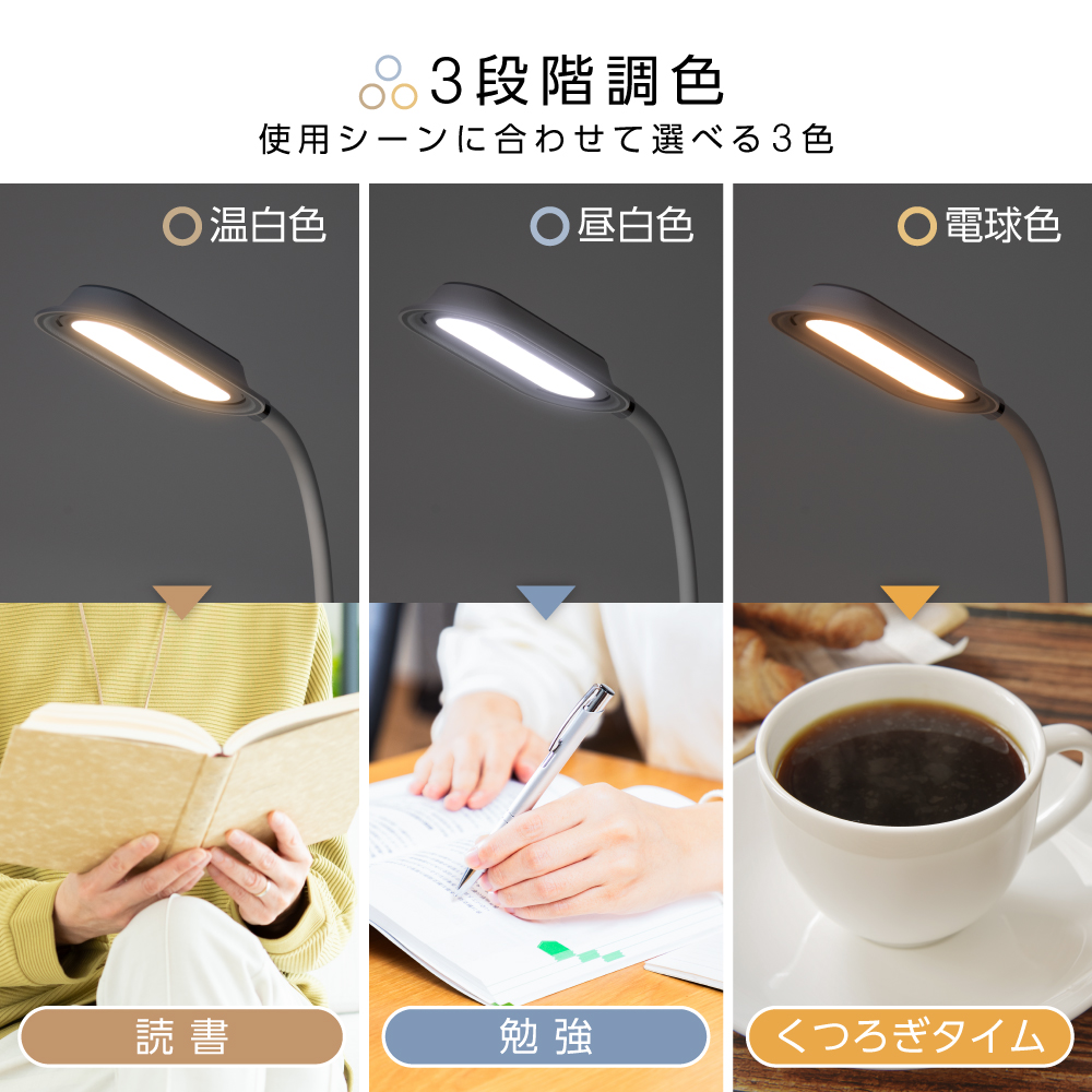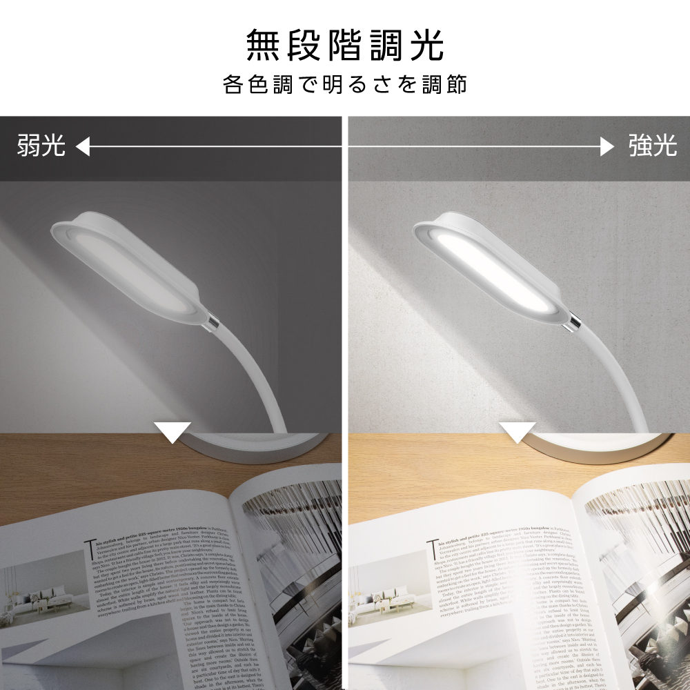 無段階調光と3段階調色、フレキシブルアームで使用シーンに合わせて調節可能