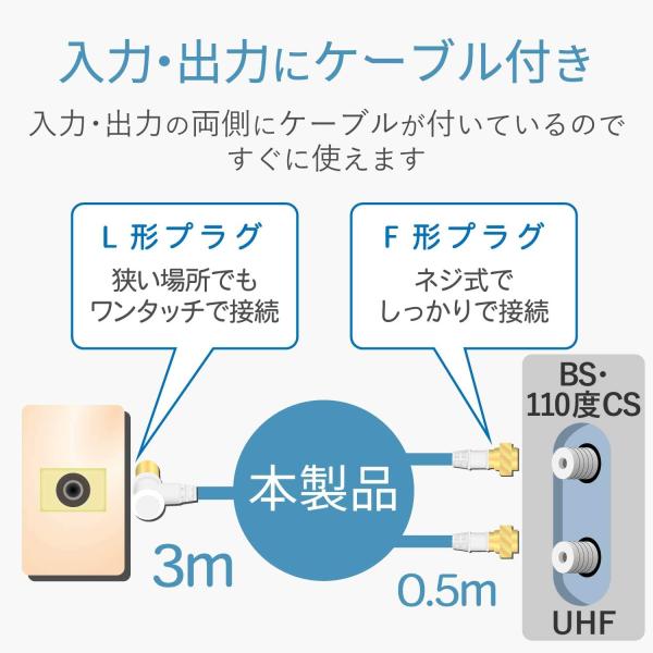 入力側ケーブルが3mなので、壁面TV端子とテレビやレコーダーが離れている場合に最適です。